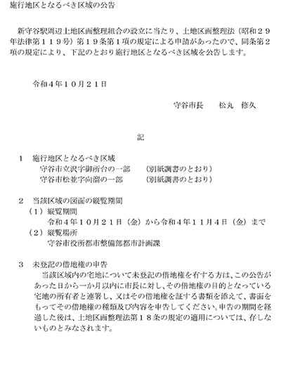 (仮称)新守谷駅周辺土地区画整理事業(以下「本事業」という。)は、取手都市計画事業として、地権者が組織する土地区画整理組合による施行を推進するものであり、令和5年度の事業認可(組合設立認可)を予定しています。